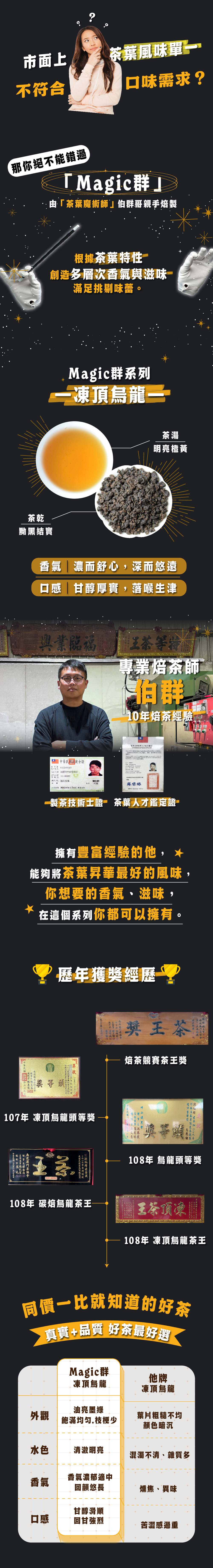 擁有10年焙茶經驗、無數比賽榮耀,將每片茶葉焙出極致的香氣與滋味,細品每一口,滿足你對完美茶葉的所有想像。